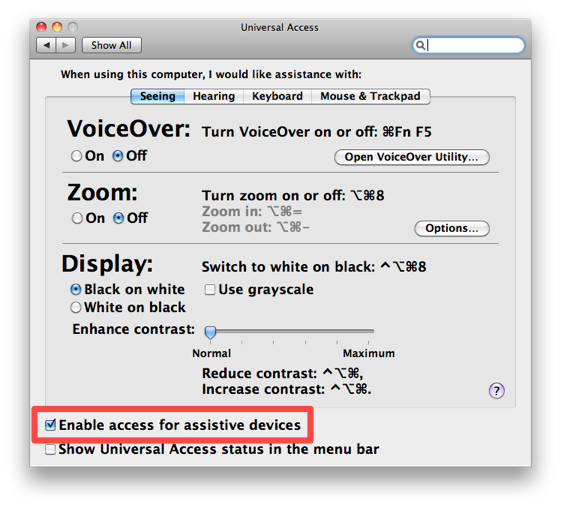 Click on the "Open Universal Access" Button to bring up the Universal Access System Preferences